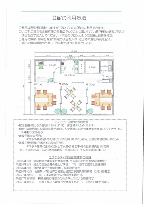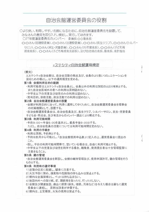 2015年4月から運用されており、自治会の理事会、各部会、自主防災会の会議や、エステふれあい祭り、防災訓練の活動拠点、長生クラブ・シルバーサロン・各サークル活動の催し物、その他の会場として活用されています。