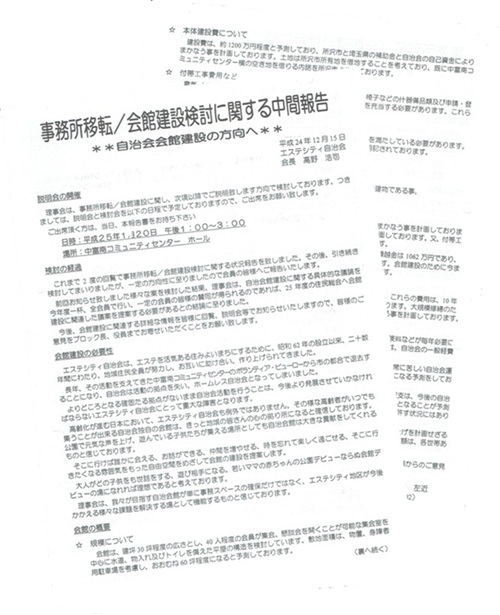 また、自治会は2010年(平成22年)に会館建設について会員の方々から意見を聴取するなどさまざまな角度から検討を重ねた結果、自治会館を建設する方向で進めることとしました。