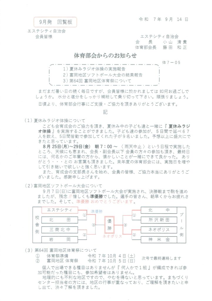 令和7年活動計画・富岡地区まちづくりセンターや協力団体などが主催する体育事業へ参加する希望者があれば、選手の参加とりまとめを行うと共に、運営支援活動の実施・エステシティ自治会員のニーズを把握し、健康増進とコミュニケーション向上を図る