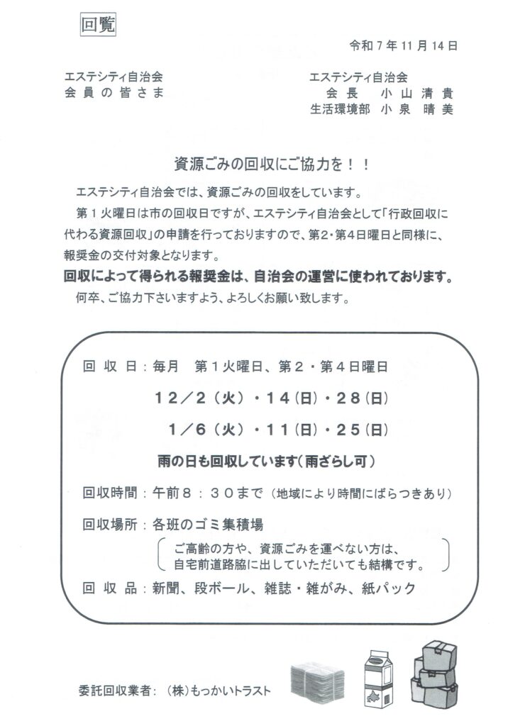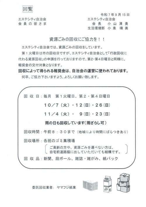 エステシティ自治会では、独自の取り組みとして「資源ごみの回収」を行っています