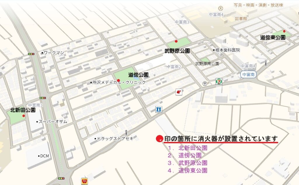 自治会が管理している消火器が下の地図の●印のところに置いてありますので、いざという時にはご使用いただきたいと思います。
