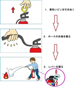 消火器を運ぶときは、レバーの下側を持ちましょう